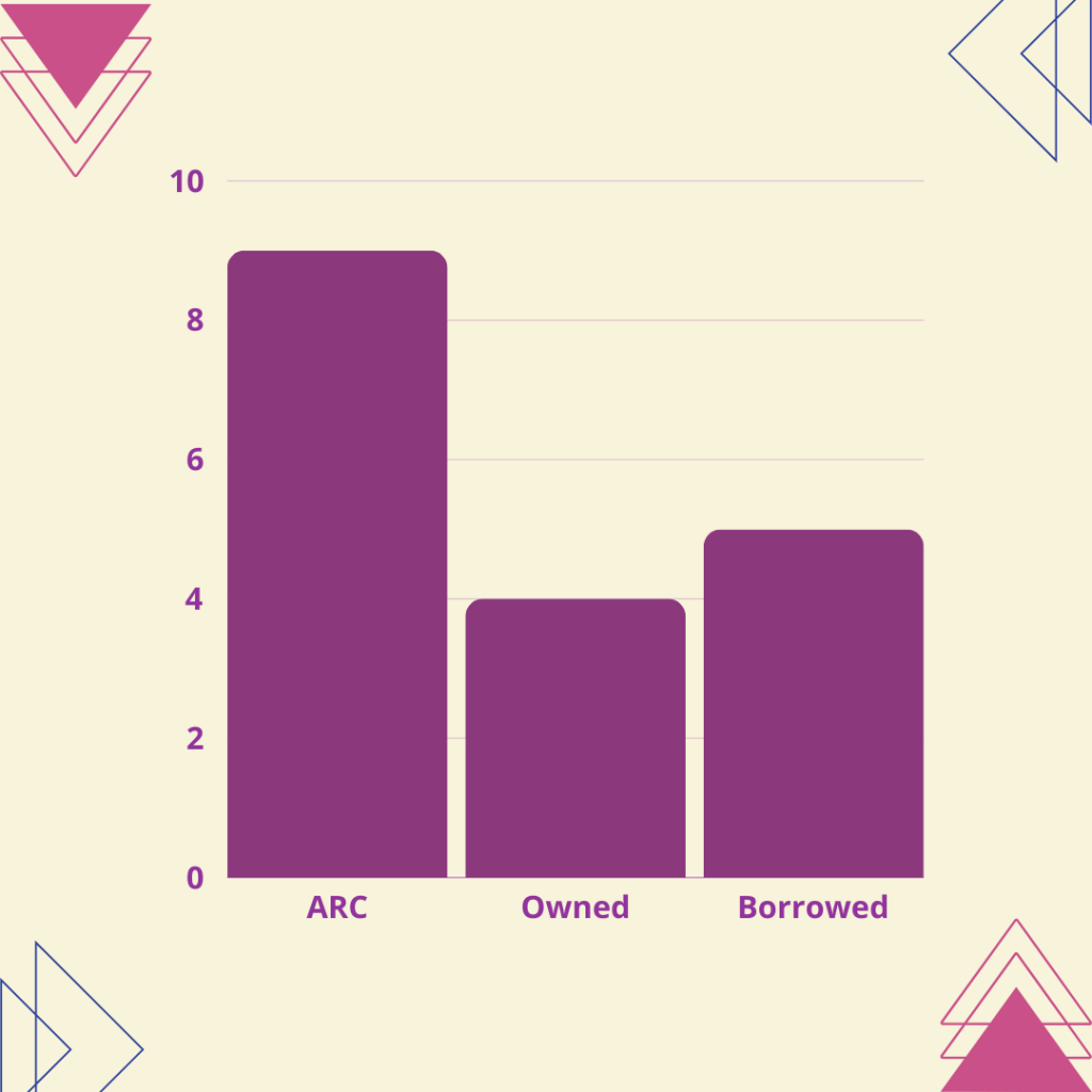Another switch up adult books have been more popular for me this year, although it’s not quite as big a gap as last year, the MG is the same as it was at this point over the last two years, which I feel is maybe a sign that I am not going to pick them up but I’ll not rule it out yet. I have recently discovered my local library so have added a new option of borrowed, which will certainly help my bank balance, I am glad to see that my ARC bar is higher this year because I am trying to catch up with my Netgalley backlog.