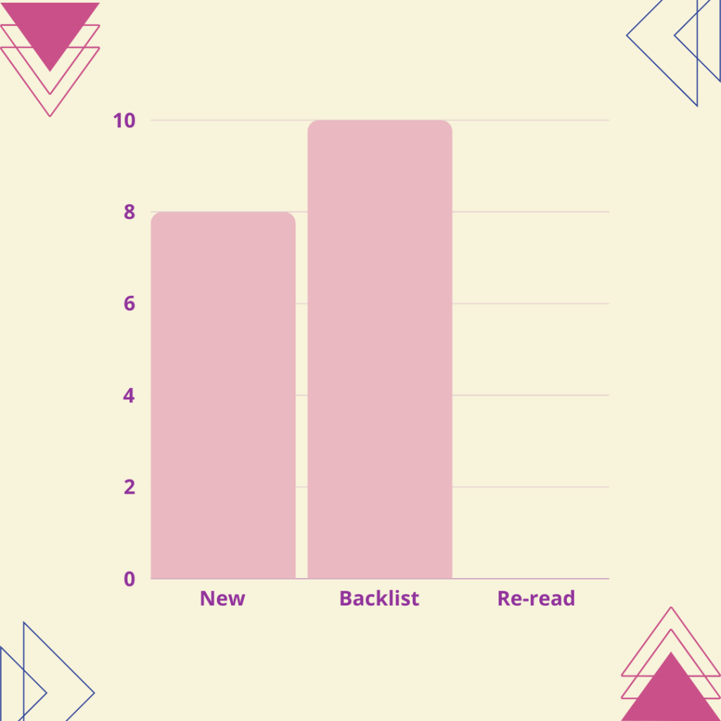For the first time the Ebook is not my preferred format, its nice to see that I am still managing to read fairly evenly across them though, I did think audiobook might have made it as the front runner because I have been favouring them recently. I am happy to see that backlist books is higher because that is always one of my goals to work through some of the books that have been in my TBR the longest.