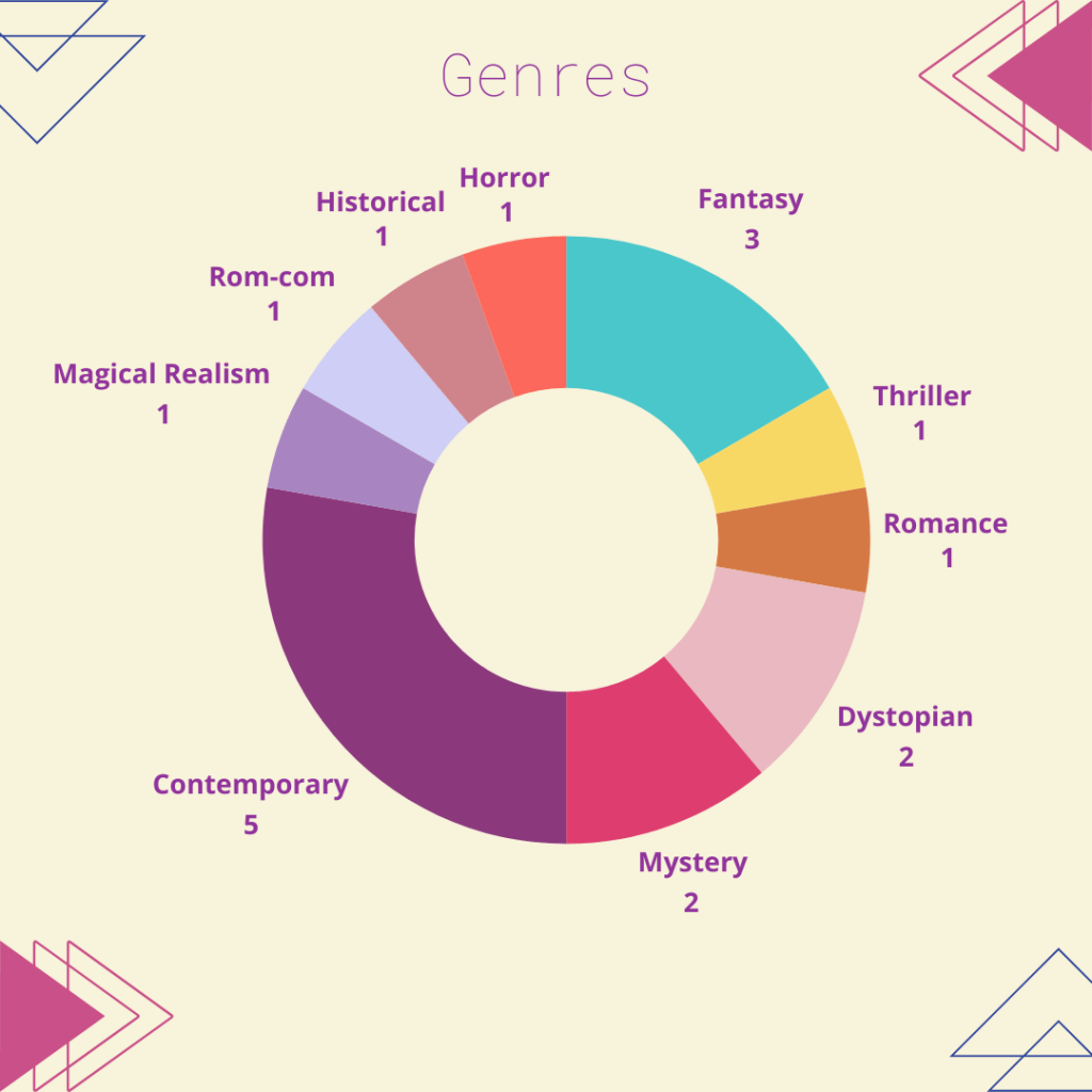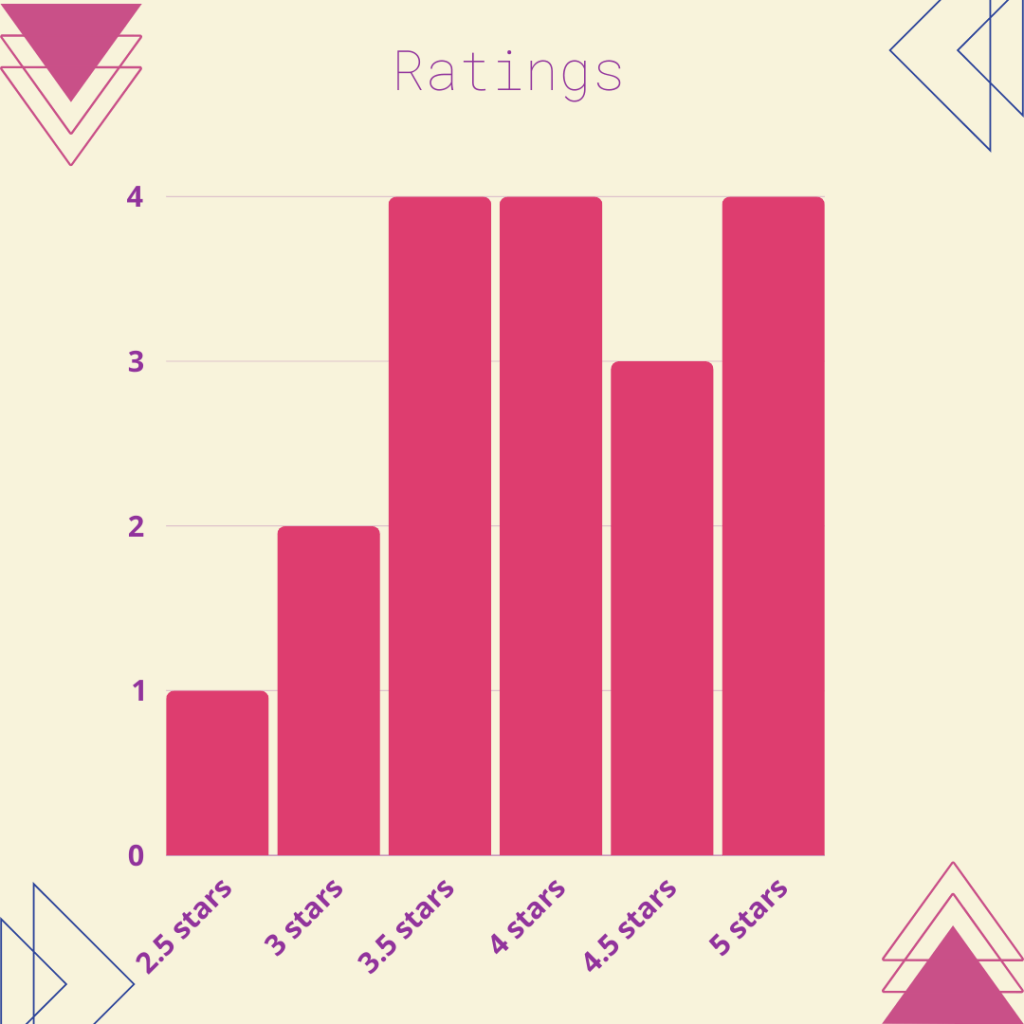 In an unusual turn of events my usual genres are not the stand out ones this time around, I am glad to see that I still am managing to read with some variety though. My ratings are a bit more varied this year but I’m glad to see that above three stars are more prevalent because its always good to read books I enjoy.