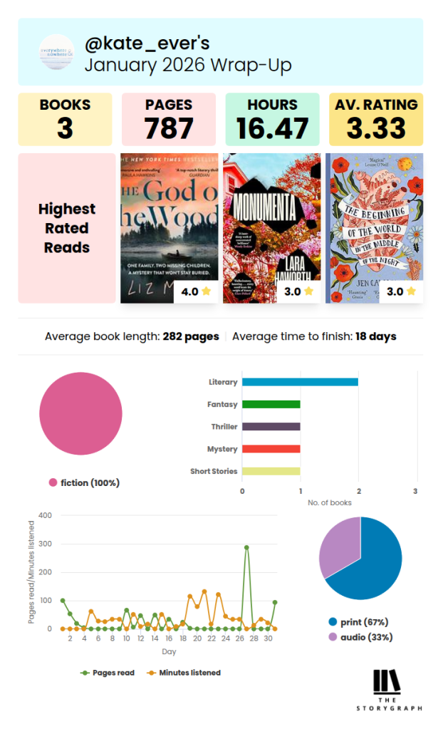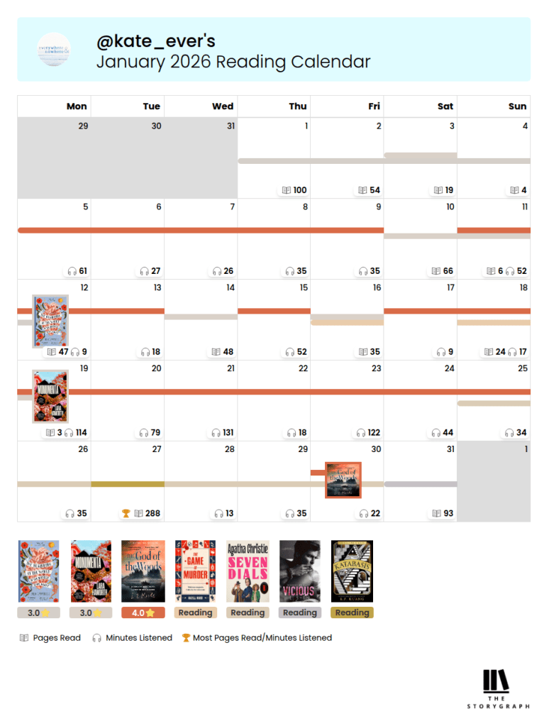 We have come to the end of the first month of 2026 and it actually went by quite quickly for a change. Didn’t manage as much reading as I thought I might, because I ended up busier than expected, but I did manage to catch up on some books that I had started reading at the tail end of 2025. I’ve been updating my reading everyday on The StoryGraph and that has really helped me to be more consistent with reading, so I’m hoping to continue that for the rest of the year…also because it has some really cool graphics which I am a sucker for.